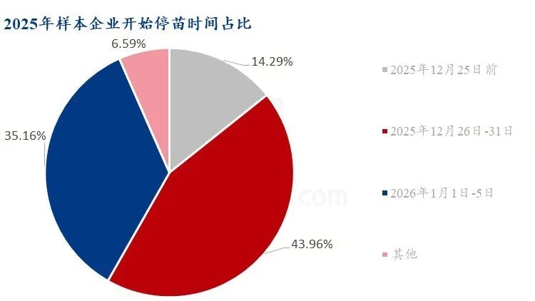 数据来源:钢联数据 从2025年白羽鸡苗样本企业开始停苗的时间分布来看,主流停苗窗口集中在12月26日至31日,该时段停止出苗的企业占比达43.96%,成为行业普遍选择的停苗节点。 其次,约35.16%的企业将停苗时间安排在2026年1月1日至5日,多为规模较大、计划性较强的大型孵化企业。 相比之下,仅14.29%的企业在12月25日前停苗,调研显示这类企业以小型孵化场为主,受资金、库存或区域市场节奏影响,提前进入停苗期。 此外,另有6.59%的企业因内部生产计划调整,停苗时间与主流节奏明显错位,体现出经营策略的差异化。 三、停苗周期聚焦11–20天,行业产能调控趋于理性