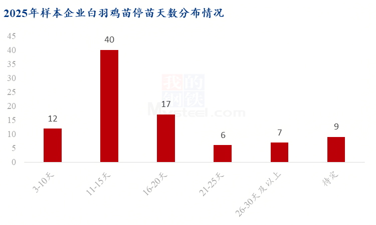 数据来源:钢联数据 根据对90余家样本企业的调研统计,2025年白羽鸡苗停苗天数呈现明显集中趋势,其中,停苗5–10天的企业有12家;11–15天为最主流区间,涉及40家企业;停苗16–20天的有17家;21–25天的有6家;停苗30天及以上的有7家,多为父母代种鸡换羽、新种鸡衔接不上、对后市信心不足的小型孵化企业。另有7家企业因计划安排尚未最终确定,停苗天数暂未明确。整体来看,超六成企业停苗周期集中在11–20天,此点也可反映出行业在产能调控方面有意寻求平衡。 四、商品苗高价难掩隐忧,停苗周期安排解析 综上所述,结合Mysteel农产品对山东、河北、山西、安徽、湖南、陕西等主产区90余家种禽企业的停苗周期调研汇总来看,2025年各企业停苗时间分化,节奏不一。究其原因,主要有以下四点: 其一,当前商品苗价格维持高位,企业仍处盈利区间,提前淘汰父母代种鸡意愿偏低,停苗后的复孵时间更多依据自身种蛋供应计划安排;其二,部分小型孵化企业对后市行情信心不足,担忧市场风险,因而推迟种蛋订购或迟迟难以敲定上孵计划;其三,各企业鸡苗预排计划存在差异,导致种蛋上孵节点错位;其四,父母代种鸡存栏在不同企业间分布不均,部分企业或受制于种蛋库存积压、受精率波动及孵化效率等问题,使得停苗决策分化。多重因素交织,共同导致今年停苗周期呈现分散化。 七禾带你去调研,最新调研活动请扫码咨询