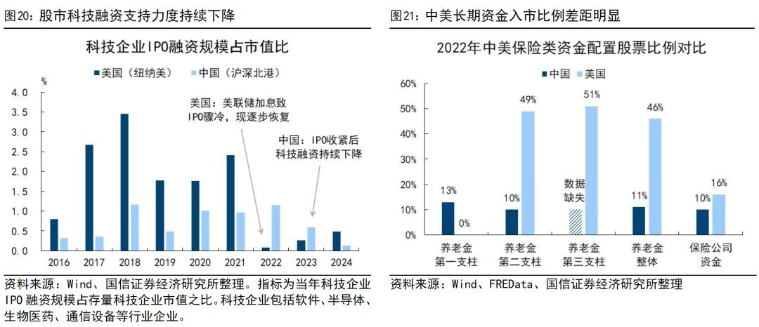 二是推动主体。政府在经济中的角色,随着生产力组织形态的迭代不断演化。2008年,政府是基建“操盘手”。2015年的棚改中,则进化为更具市场化色彩的“合伙人”。2020年高技术产业突围战,政府退居“孵化器”,企业走向前台。中央经济工作会议指出,要“有效激发民间投资活力”。未来,政府的角色应进一步转为“搭台子”,构建“有效市场+有为政府”的新模式,积极撬动社会资本、激发民间力量。在完善规则的同时,将要素配置权进一步交给市场。 这意味着,资本市场将成为推动投资回升的新载体。产业结构决定融资结构,此前我国房地产和基建等传统支柱更多依赖间接融资,而科技行业则需要直接融资的支持,因此壮大直接融资体系、激活民间资本是产业转型的必经之路。当前,我国直融占比仅为11.7%,与美国(73.7%)仍有明显差距。美国直接融资体系的成功,是以《1933年证券法》《格拉斯-斯蒂格尔法案》等规则框架为基础,不断试错完善的结果。 对此,提出三点建议。 建议一:加快科技类IPO节奏。 当前我国科技类IPO融资体量依然偏低。从绝对规模看,2024年A股市场募集仅93亿美元,体量不足美国的四分之一。从相对规模看,沪深北港四大交易所科技类企业去年IPO融资额占已上市科技企业市值比重也仅有0.13%,约为美国同期的三分之一,对科技企业的支持力度仍待提升。未来推动AI+投资需通过资本市场,优化IPO 流程,提升发行效率,为科技企业提供更多社会资本支持。 一是建立面向科技企业的包容型上市机制。通过适度放宽未盈利科技企业上市条件,优化交易所定位与审核规则,对承担关键核心技术攻关的企业开设绿色通道。 二是构建科技企业上市梯度培育体系。建立覆盖“专精特新”“卡脖子”等领域的国家级中小企业后备库,形成电子化、动态化的企业画像,精准支持其投融资需求。 三是完善科技企业全周期的资本供给。加强对PE/VC等早期市场化投资体系支持力度,引导机构加大科技类权益资产配置,探索更完善的科技定价估值体系。
