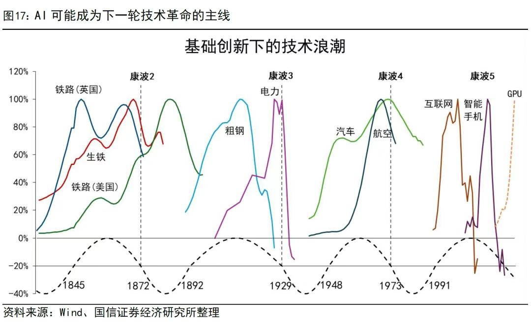 借助全球供应链紊乱下的窗口期,我国积极布局产业新动能。以“新三样”为代表的能源新技术成为焦点,带动总体投资回正。2020年,高技术产业投资增速高达10.6%,远超总投资增速的2.9%;新能源行业相关投资更为凸显,下游风电和太阳能基建投资的增速在2020年3月分别高达185.9%和193.5%。 这一变革期,市场与企业的主导作用愈发凸显,政府角色转向“孵化器”。政府通过税收减免、产业补贴等优惠政策,引导资本向高技术领域集聚。但少数地方在片面追求GDP增速的导向下,脱离自身资源禀赋,对新兴产业“一哄而上”,反而使一些新动能领域成为后续产能“内卷”的重灾区。 3.本轮回升需要股市配合AI+投资 回望前三轮投资周期,不难发现驱动投资的两条主线。 一是需求来源。投资走弱本质是经济动能发生切换。随着旧有需求被不断满足,投资回报下降,内生激励不强。固然可以通过外部手段一时对冲,但长期副作用不容低估。这时,寻找“新质增量”是关键。 这次,投资谷底回升需要依托AI+领域的投资。一方面这是AI革命自身带来的广阔投资机遇;另一方面这也是落实建设现代化产业体系的国家战略的关键。 从国家战略的导向看,AI有“双重角色”,它既是现代化产业体系的重要组成,又是核心驱动。中央经济工作会议强调“坚持创新驱动,加紧培育壮大新动能”,深化拓展“人工智能+”。“十五五”规划《建议》中也指出,要全面实施“人工智能+”行动,一方面以人工智能引领科研范式变革,另一方面赋能千行百业。