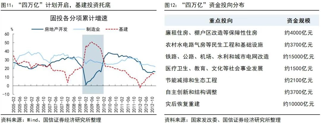 2008年:次贷危机后“大基建”开启。2005年起,我国投资增速的阶段性下行并非市场的自发调整,更多是为防范经济过热,政府主动加强调控的结果。随着次贷危机爆发,我国地产投资几近停滞,2009年2月下探至1.0%,创1999年以来最低水平。2008年11月,政府主导的“四万亿”刺激计划出台,重点投向铁路、公路、机场和灾后重建等领域,“大基建”时代开启,投资进入新一轮繁荣期。 这一轮投资浪潮中政府直接参与度较高。在集中力量办大事的优势下,经济迅速企稳,基建增速在2009年6月一度超过50%,总体投资增速也拉升至30%以上。但资源过度集中也带来超前、低效建设等问题,并一定程度上挤压了市场化投资,为后续经济结构失衡埋下伏笔。政策随即于2011年前后收紧,此时地方融资平台及地方金融机构在基建项目上配套的资金规模,已远远超过“四万亿”。
