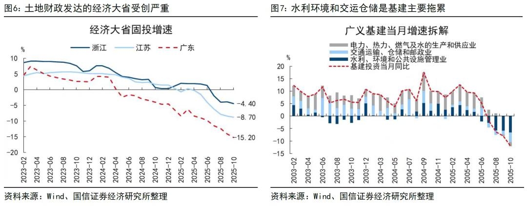 二是基建“稳定器”失灵。基建投资作为宏观调控的重要抓手,常被视为熨平经济波动的“稳定器”。然而,当前基建投资接续乏力,10月当月同比增速降至-12.1%。短期主要受三方面制约: 第一资金端。土地财政降温后,叠加平台融资能力下降,一些经济大省的投资能力显著削弱,广东、江苏和浙江的固投累计增速分别降至-15.2%、-8.7%和-4.4%。 第二项目端。在“十四五”与“十五五”规划的衔接期,项目储备断档。例如,水利环境和交通运输分别拖累基建投资6.5和3.9个百分点。 第三政策端。严格财政纪律下,地方更侧重防风险,倾向于将财力优先用于“三保”和化债,对新增项目可能带来的长期财政负担持谨慎态度。