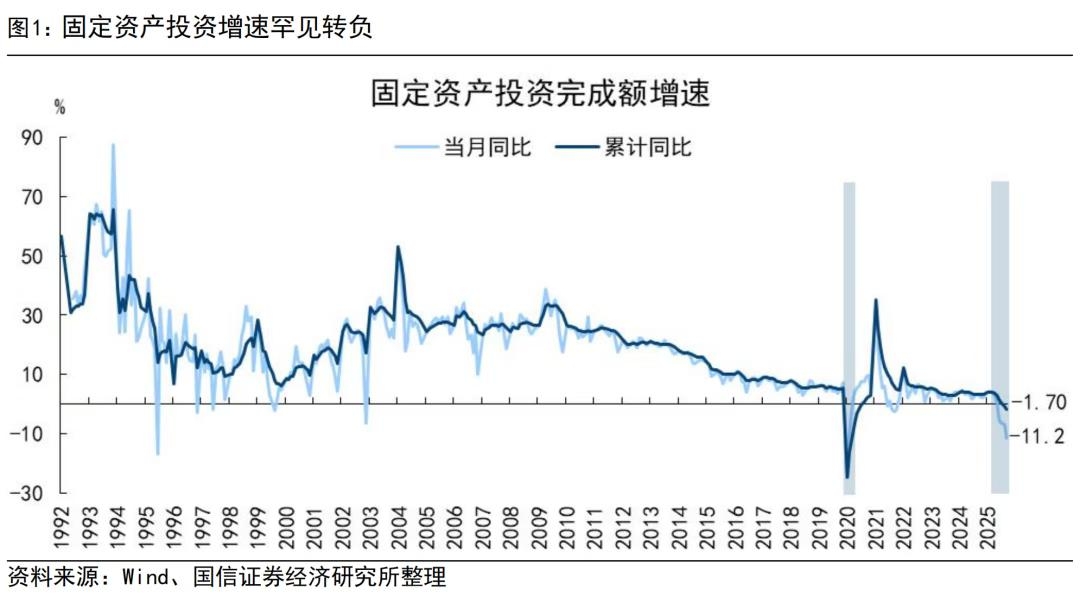 | 投资在我国不同发展阶段均扮演了重要角色,历来也是市场关注的焦点。刚刚召开的中央经济工作会议指出,做好明年的经济工作,要“坚持内需主导”,其中“推动投资止跌回稳”是关键。 然而,今年下半年以来,我国固定资产投资持续下滑,地产、基建和制造业投资三大项增速集体转负。这不禁引人深思:随着我国“家底”日厚,在从资本密集型迈向智慧密集型的“十五五”时期,投资将扮演怎样的角色?罕见的负增长如何扭转? 1.史上罕见:投资增速为负 长期以来,投资作为拉动我国经济增长的关键引擎,其增速持续高于整体GDP增速,是“三驾马车”中不可或缺的特殊角色。历史上,投资增速为负的情况极其罕见,即便在2020年新冠疫情暴发初期,其负增长也仅持续了两个月。 今年我国投资增速可能出现有数据以来的首次年度负增长。二季度以来,固定资产投资持续下行,从7月单月同比转负,到10月降幅已扩大至-11.2%;累计同比也连续两个月为负,预计年度增速-1.0%。投资增速转负,背后是占其七成以上的三大支柱:制造业投资、房地产开发投资和基建投资增速的“共振下行”,其中原因各异。