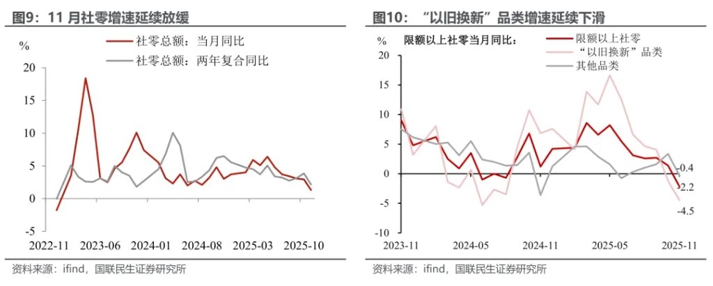 消费:促消费政策力度减弱叠加“双十一”前置影响,社零增速延续放缓。11月社零增速延续下行至1.3%,消费市场复苏节奏阶段性放缓。究其原因,一方面,受今年“双十一”促销活动前置的影响,10月部分消费需求集中释放,对11月社零增长形成分流;另一方面,临近年末,“国补”政策资金所剩无几,叠加去年同期基数较高的影响,前期“加力扩围”相关消费品增长动能延续回落。