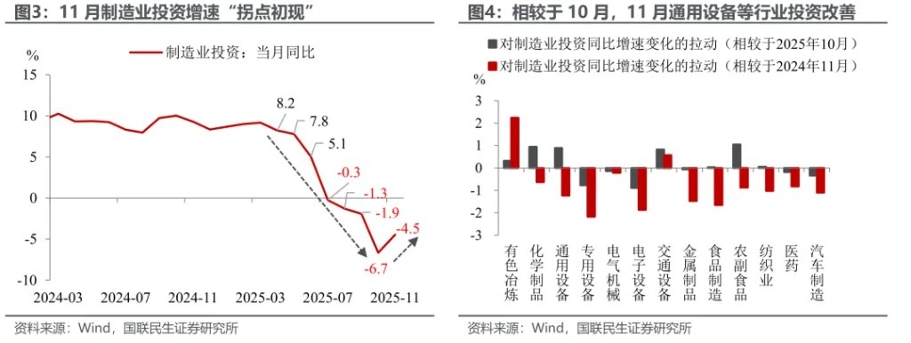 不过值得注意的是,11月高技术产业工增同比不降反升,这不仅与“高质量发展”的政策导向吻合,同时也说明了“反内卷”举措塑造了一个更规范、更注重长期创新的市场环境,有利于研发密集型产业释放活力。其全面效果仍需后续企业盈利、投资信心等数据进一步验证。 制造业:4月以来的“拐点初现”。自4月美国加征关税以来,制造业投资同比增速便处于下行通道,然而11月增速却从10月的-6.7%、小幅回升至-4.5%,一改往日的下行趋势,释放积极信号,我们认为制造业增速改善的主因在于出口下行压力的持续缓释。比如相较于10月,投资增速出现改善的制造业行业,主要也与出口挂钩,包括通用设备、交通设备等。