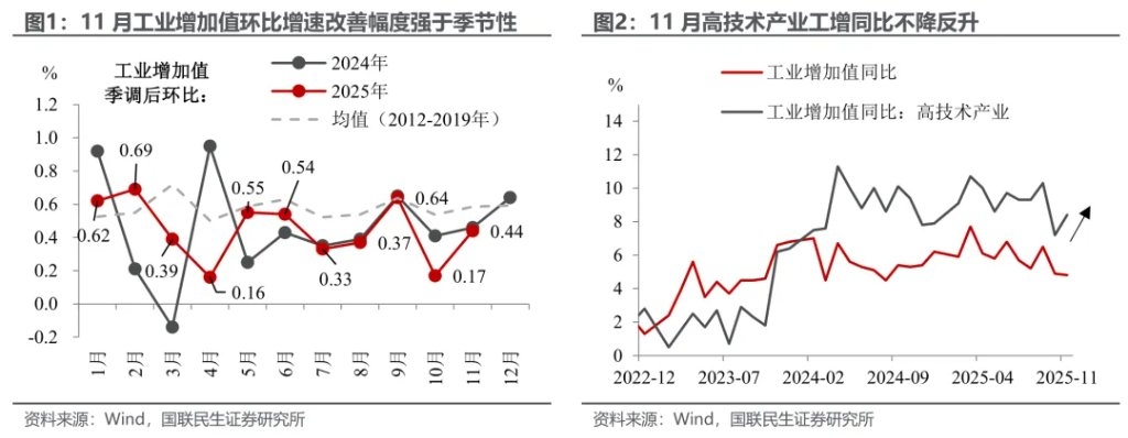 | 11月经济呈现出 “工业稳、投资与消费缓” 的格局。鉴于政策效果将在明年一季度更为充分显现,当前消费与投资仍面临阶段性逆风,“谁先企稳”对明年经济“开门红”具有关键的信号意义。对此,我们认为可以从如下角度考虑: 投资端:“乌云中的银线”。虽然房地产下行压力仍在释放,但基建与制造业已不时释放积极信号:11月制造业投资增速止跌回升,初步显现“拐点”;建筑业PMI表现偏强,叠加新增专项债加速发力项目建设,表明“稳投资”的政策储备与执行已在跟进。 消费端:增速放缓背后的复杂局面。除高基数效应外,前期“国补”政策的火热、“双十一”促销前置,均在一定程度上透支了部分消费力,对短期消费增速形成压制。长远来看,消费复苏仍需依赖消费场景实质性拓展以及居民收入预期改善。 尤其在中央经济工作会议“推动投资止跌回稳”的指引下,“稳投资”政策意图明确。投资有望先于消费实现企稳,成为支撑明年一季度“开门红”的主要亮点。后续关键仍在于政策“愿望清单”能否如期兑现、向实物工作量有效转化。 工业:同环比背离释放了哪些信号?与改善幅度明显强于季节性的环比增速不同,11月工业增加值同比增速却小幅放缓至4.8%(前值4.9%),两者的背离则是释放了不同的关键信号——环比的改善,更多源于出口压力的缓释;而同比的下滑,则是受到今年“反内卷”政策的一定影响。