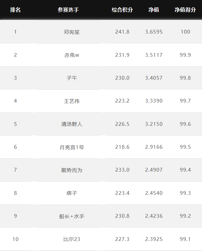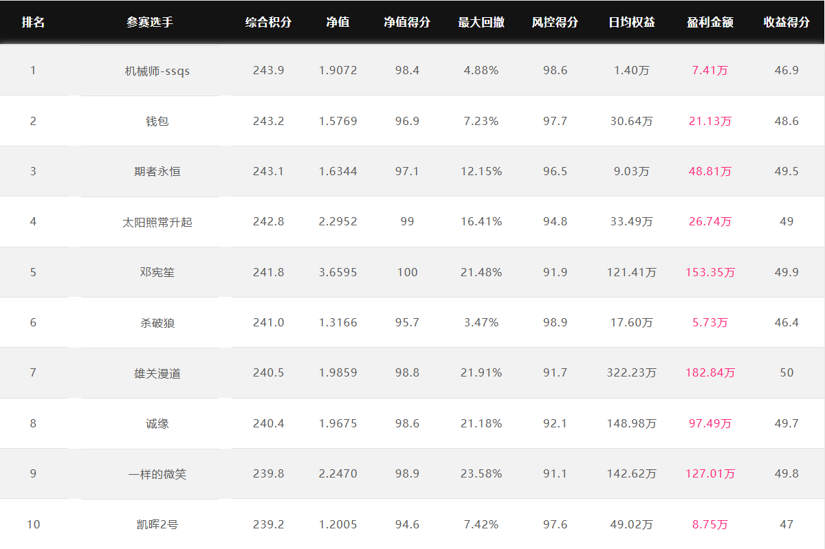 奖金上不封顶 特定期货公司参赛奖金翻倍 优秀选投 每周选优秀选手对接资金 达标必投 单笔最多给1个亿管理型资金 管理型资金盈利分成20%~70% 免费培训/研报/调研/咨询 诚邀您参赛! 为了促进国内期货市场交易人才的发展和成熟,七禾网举办本次“期货CTA英雄联盟”实盘大赛&超级服务,招募优秀的操盘手,为优秀的交易人才搭建桥梁! 第四届大赛圆满结束,第五届荣耀开启,欢迎参赛!第五届大赛已于2025年7月1日开赛,火热报名中,比赛过程中持续接受报名,大赛奖金&管理型资金&超级服务,等你来领! 2023年2月16日后,在主办方指定的几家期货公司中的某一家C公司新开户参赛,享奖金翻倍! 在主办方指定的几家期货公司中的某一家B公司新开户参赛,享奖金翻倍! 大赛中的优秀选手,只要在大赛中有3个月及以上的实盘业绩,主办方将每周发送优秀参赛者的业绩、资料给合作的数十家资方,供其考察是否投管理型资金。至2022年8月12日,资方已选出23名优秀投顾,累计投入超5.5亿元管理型资金。 优秀选投:通过主办方及资方考核后,将获得管理型资金(资金来源:七禾网自有资金(买优秀选手的基金产品)、七禾网股东、数十家合作资方) 在主办方指定的几家期货公司中的某一家B公司新开户参赛,以及2023年2月16日后,在主办方指定的几家期货公司中的某一家C公司新开户参赛,可以按照:“达标必投”进行考核(将给予单笔100万元~1亿元的管理型资金,分红比例20%~70%),详细规则请联系微信:15858201632 大赛综合排名前10名 2025.12.15