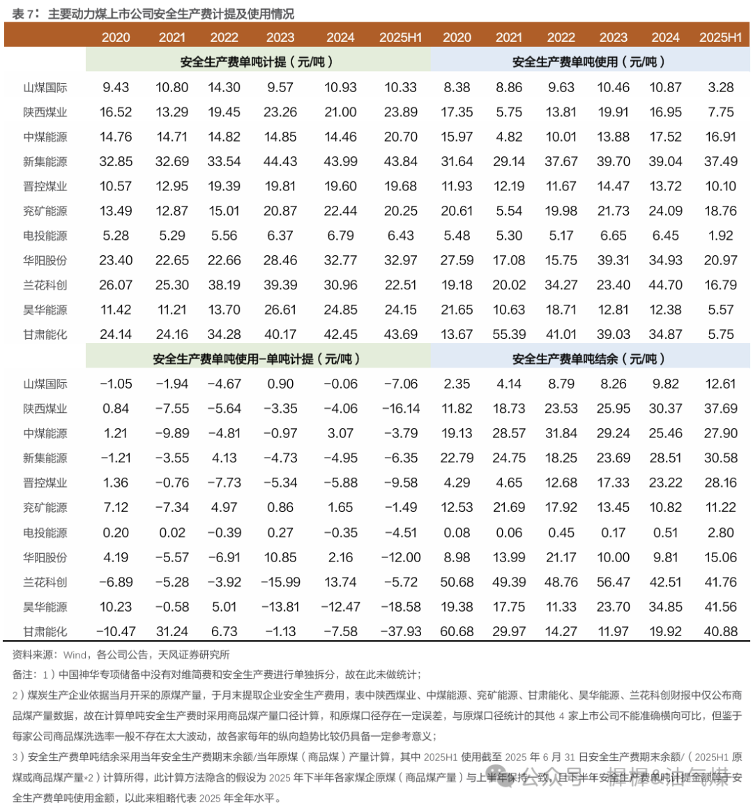 4)维简费:维简费是我国境内所有煤炭生产企业从成本中提取,专项用于维持简单再生产的资金。企业根据原煤实际产量,每月按下列标准在成本中提取煤矿维简费,其中:河北、山西、山东、安徽、江苏、河南、宁夏、新疆、云南等省(区)煤矿,吨煤8.50元;黑龙江、吉林、辽宁等省煤矿,吨煤8.70元;内蒙古自治区煤矿,吨煤9.50元;其他省(区、市)煤矿,吨煤10.50元。经梳理: a.各家上市公司维简费每年单吨计提变动幅度不大,企业或基本按照要求计提,但在维简费的使用上年度间波动相对较大; b.在2025年煤炭行业经营业绩承压的情况下,中煤能源、新集能源等公司相比2024年的单吨维简费使用上有较为明显提升,一定程度上通过降本缓解煤价下滑带来经营压力; c.从维简费单吨结余来看,大部分煤企单吨结余并不多,普遍在10元/吨以下,说明煤企靠维简费的使用进行降本的空间相对有限。 5)安全生产费:安全生产费用是企业按照规定标准提取在成本(费用)中列支,专门用于完善和改进企业或者项目安全生产条件的资金。2022年国内发布《企业安全生产费用提取和使用管理办法》(财资〔2022〕136号),对于煤炭生产企业,将煤(岩)与瓦斯(二氧化碳)突出矿井安全费用提取标准,由每吨煤30元上调到50元,相比此前计提标准有所提高;此外,新增规定了高瓦斯矿井,水文地质类型复杂、极复杂矿井,容易自燃每层矿井吨煤计提30元的标准。煤炭生产企业依据当月开采的原煤产量,于月末提取企业安全生产费用,且当企业安全生产费用月初结余达到上一年计提金额3倍及以上的,自当月开始暂停提取安全生产费用,直至安全生产费用结余低于上一年应计提金额三倍时恢复提取。经梳理: a.2022年安生生产费新规提高部分计提标准后,煤企单吨安全生产费计提金额多数不同程度增长,说明计提标准的提高提升了煤矿的生产成本,但除了中煤能源、兰花科创等外,2023年至今多数煤企单吨计提金额并无明显变化,表明安全生产费的计提对成本波动影响较小; b.2025H1煤企安全生产费单吨使用金额较2024年全年水平有不同程度降低,导致2025H1安全生产费单吨结余普遍有不同程度增长,但从2025H1单吨结余与单吨计提金额比较来看,结余金额普遍没有达到计提金额的3倍,故短期内煤企普遍或无法通过阶段性暂停提取安全生产费用来降低成本。