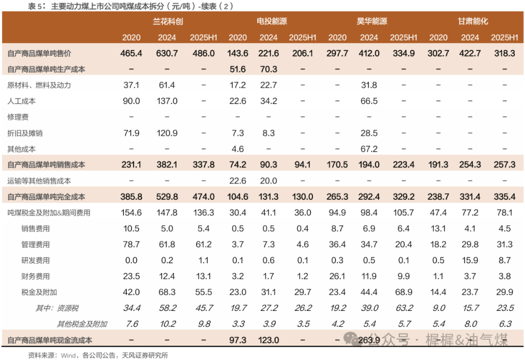 所选取的12家上市公司中,中国神华由于煤炭销售规模大、产品种类较多、部分自产煤与外购煤混合运输及销售等原因,在2020年财报中没有按煤炭来源(自产煤和外购煤)分别核算煤炭销售收入、成本及毛利,华阳股份则由于在2020年财报中同样未区分自产煤及外购煤财务数据,同样无法单吨拆分自产煤成本。为方便比较,我们用中国神华、华阳股份外的10家动力煤上市公司数据进行计算,以各家公司2025H1自产煤销量为权重,结合各家公司2025H1自产煤吨煤销售成本和吨煤完全成本,计算得到10家上市公司的加权平均吨煤销售成本及加权平均吨煤完全成本,结论如下: 1)10家上市公司吨煤销售成本及吨煤完全成本在2020年以来基本有不同幅度的提升,与上文图7的趋势一致,其中:2020年10家动力煤上市公司加权平均吨煤销售成本184元/吨,2024年提升至273元/吨,提升幅度为89元/吨;2020年10家动力煤上市公司加权平均吨煤完全成本266元/吨,2024年提升至361元/吨,提升幅度为95元/吨。 2)2025年上半年国内煤炭行业基本面承压、价格走弱,在此背景下煤企普遍采用降本增效措施,部分煤企吨煤销售成本及完全成本较2024年有所下降,但从以上10家上市公司来看,10家动力煤上市公司加权平均吨煤销售成本280元/吨,较2024年提升7元/吨,10家动力煤上市公司加权平均吨煤完全成本361元/吨,与2024年基本持平,整体而言10家上市公司在2025H1吨煤成本较2024年变化不大。但其中,陕西煤业2025H1吨煤成本上升明显,2025H1公司吨煤销售成本305元/吨,较2024年上升45元/吨,吨煤完全成本380元/吨,较2024年上升49元/吨,或主要与公司“一票制”结算下,运费成本增加有关,剔除该影响后,根据公司公告,吨原选煤完全成本280元/吨,同比下降 1.39 元/吨。故从上市公司来看,在2025年煤价下行阶段,煤企吨煤成本总体已经进行了一定程度的压降。