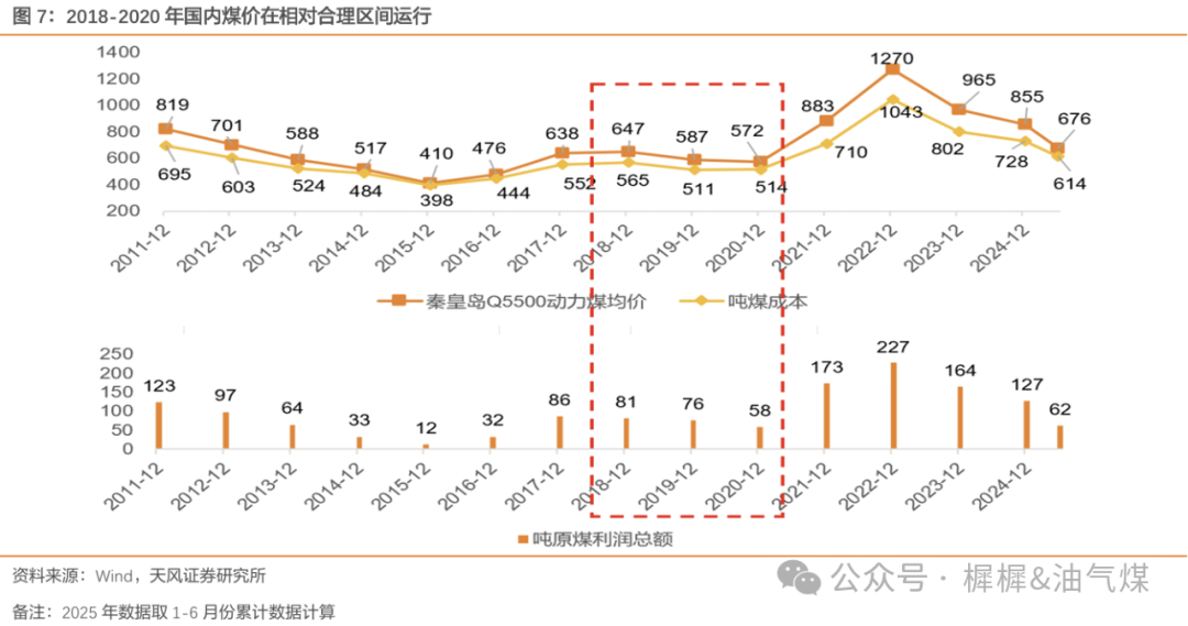 综上所述,出于煤价要覆盖煤企完全成本的角度来看,合理区间下限即港口动力煤Q5500价格在620元/吨以上较为合理。2018-2020年国内煤价在相对合理区间内运行,参照统计局数据口径,对应吨原煤利润总额在60-80元/吨左右,彼时港口吨原煤完全成本在515-565元/吨水平;2025年上半年规上原煤利润总额再次回落至60元/吨左右水平,但对应港口吨原煤完全成本提升至615元/吨水平,较2018-2020年提升约50-100元/吨,此时对应2025H1秦皇岛港Q5500动力末煤均价在676元/吨。 与此同时,我们通过拆分部分动力煤上市公司成本进行验证,10家上市公司吨煤销售成本及吨煤完全成本在2020年以来基本都有不同幅度的提升,其中2020年10家动力煤上市公司加权平均吨煤销售成本184元/吨,2024年提升至273元/吨,提升幅度为89元/吨,2020年10家动力煤上市公司加权平均吨煤完全成本266元/吨,2024年提升至361元/吨,提升幅度为95元/吨。2025H1煤企或通过降本增效一定程度上降低了完全成本,考虑到近年来煤企成本提高因素具有一定刚性,成本进一步降低的空间已相对有限,煤企成本或难以降回至2020年前水平。故我们认为,如果区间下限570元/吨主要保证煤企能够有部分盈利,则当前底部区间或应提升至620元/吨以上。