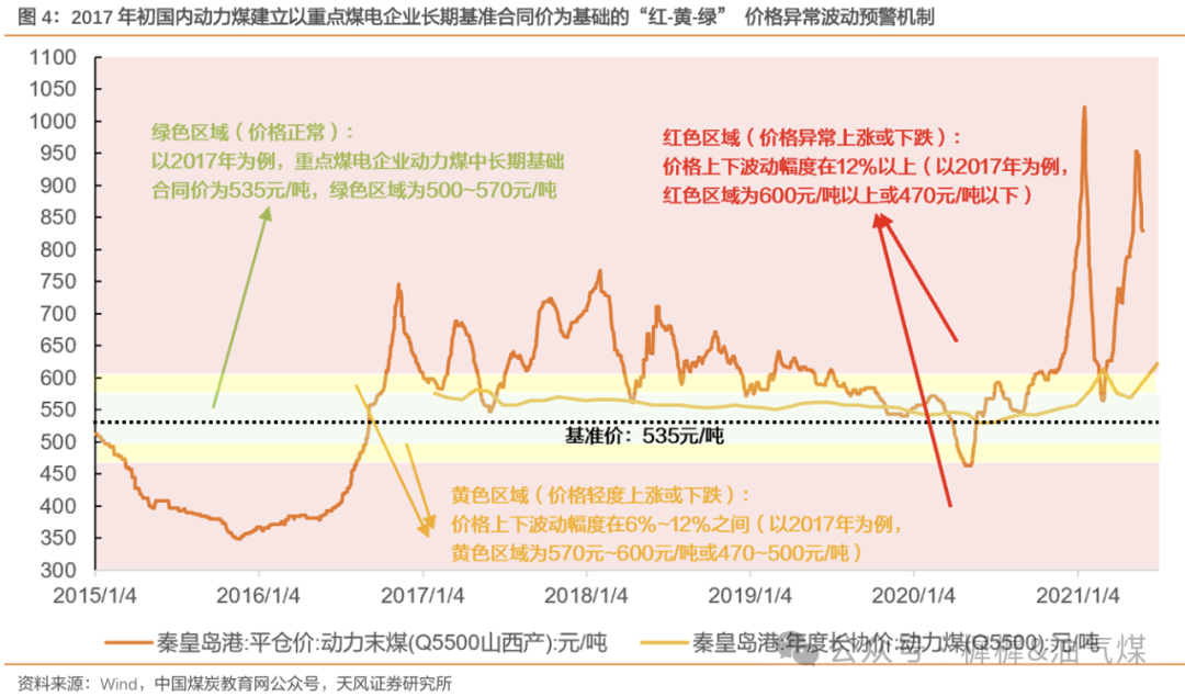 2017年初,为平抑煤价大幅波动、保障上下游产业健康发展和经济平稳运行,国家发展和改革委员会、中国煤炭工业协会、中国电力企业联合会和中国钢铁工业协会联合下发《关于印发平抑煤炭市场价格异常波动的备忘录的通知》,明确煤炭价格合理区间。《通知》提出,2016-2020年期间,在煤炭综合成本的基础上,充分考虑煤炭市场发展情况、经济社会发展水平、社会可承受能力等因素,按照兼顾煤电煤钢双方健康、稳定发展的原则,原则上以年度为周期,建立电煤钢煤中长期合作基准价格确定机制;以重点煤电煤钢企业中长期基准合同价为基础,建立价格异常波动预警机制,动力煤价格划分为“红-黄-绿”三种区域。当价格位于绿色区域,充分发挥市场调节作用,不采取调控措施;当价格位于黄色区域,重点加强市场监测,密切关注生产和价格变化情况,适时采取必要的引导措施;当价格位于红色区域,启动平抑煤炭价格异常波动的响应机制。2017年提出价格异常波动预警机制后,秦皇岛港Q5500长协价格基本在绿色区域内运行,港口现货价格在2017、2018年呈现宽幅震荡格局,在2018年年中后,随着煤炭产能逐步释放,同时经济增速放缓压制需求,多重因素影响下价格中枢连续下移,市场交易活跃度降低,港口现货价格亦逐渐收敛在绿色及黄色区域内(470-600元/吨)窄幅波动。