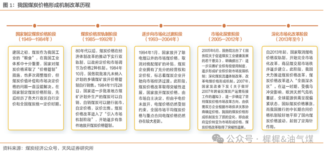 | 引言 2025年6月国家发改委价格司发布2025年度课题委托研究征集公告,其中招标课题之一为《改革完善煤炭市场价格形成机制研究》(研究重点:围绕煤炭市场和价格运行情况、煤炭生产和流通成本变动、煤电企业经营状况等,对煤炭价格区间调控政策实施效果开展综合评估,系统梳理政策执行效果、存在的主要问题,在分析研判今后一段时间煤炭、煤电市场和价格形势基础上,提出改革完善煤炭市场价格形成机制的意见建议),在2022年国家发改委印发《关于进一步完善煤炭市场价格形成机制的通知》后,时隔三年再次讨论煤炭市场价格形成机制。 1. 我国煤炭价格形成机制及价格合理区间变革历程 新中国成立至今,我国煤炭价格形成机制经历了从国家制定煤炭价格阶段、煤炭价格双轨制阶段、逐步向市场化过渡阶段、市场化探索阶段、深化市场化改革阶段的转变。20世纪80年代前,煤炭价格主要由国家制定,1994年1月国家放开了除电煤以外的市场煤价格,取消对统配煤矿的补贴,煤炭企业拥有了充分的经营权和定价权,标志着煤炭企业开始向市场经济过渡。2012年12月国务院发布《关于深化电煤市场化改革的指导意见》,提出要形成科学合理的电煤运行和调节机制,2013年经国务院同意,我国取消电煤价格双轨制,改为由煤炭企业和电力企业自主协商确定价格,同时鼓励双方签订中长期合同。