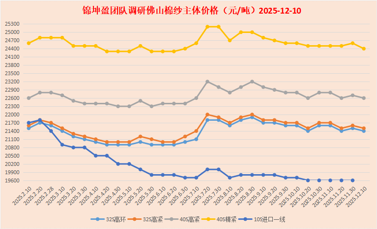 10、纺纱厂:市场低迷需求弱化,纺纱厂出货缓慢,因主动性压缩产能,大型纺纱厂库存压力不大。整体纺纱厂对后市信心缺失,原料随用随买原则,刚需采购。 11、出口:得益于中美经贸磋商取得突破,市场信心修复等因素,11月出口有所回暖,国内部分纺织集聚区外贸纺织企业订单出现环比上涨。 12、国内需求:国家层面,已将扩内需定为“十五五”宏观政策着力点,后续大量配套细化政策,将为稳定和扩大内需市场提供强有力支撑。 13、棉纱价格:受市场弱化影响,本月棉花期货价格虽延续上涨趋势,但棉纱现货价格部分品种出现回调调100元/吨左右。当前佛山市场现金含税主流报价,国产牌子货纯棉32支高配环纺21300~21400元/吨,纯棉32支高配紧密21400~21500元/吨,纯棉40支高配紧密22500~22600元/吨,纯棉40支精梳紧密24300~24400元/吨,进口一线纯棉10支赛络散货19300元/吨,整柜优惠100元/吨。