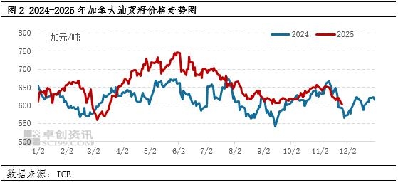 加拿大油菜籽市场供大于求,价格呈现下跌趋势 受中国企业停止采购加拿大油菜籽的影响,加拿大油菜籽出口量明显减少。加拿大谷物理事会数据显示,2025/26年度(2025年8月份至今)加拿大油菜籽累计出口量为208.7万吨,较上年度同期相比减少180.1万吨,减幅为46.32%。同期加拿大国内油菜籽压榨量为394万吨,较上年度同期相比增加1.1%。虽然国内压榨量有所增加,但是增幅较小,同时出口量减幅较大使得加拿大国内油菜籽呈现供大于求格局,在加拿大统计局上调油菜籽产量数据之后,加拿大油菜籽价格呈现连续下跌走势。据卓创资讯统计,12月16日加拿大油菜籽主力期约价格维持601.9加元/吨,较11月同期相比下跌7.04%,较2024年12月同期相比下跌1.73%。