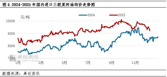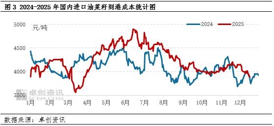 随着加拿大油菜籽价格下跌,国内进口油菜籽到港成本同样减少。据卓创资讯统计,12月16日国内进口油菜籽到港成本为3894元/吨,较11月同期相比减少5.92%,较2024年12月同期相比减少1.12%。