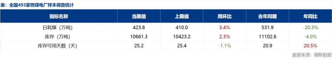 | 报告品种:动力煤 原文链接:https://mp.weixin.qq.com/s/jxLSBQI4QkGRwvblTR11LQ 近日,主产地区域内多数煤矿基本保持正常产销,降雪影响基本消退,公路运输往返恢复正常。现市场需求释放依旧有限,产地市场观望情绪浓厚,煤矿整体出货情况较差,煤价僵持偏弱运行。 需求方面,近日,局部地区阶段性寒潮频繁出现,电厂整体日耗稳步上升,但上升幅度不是很大,高库存基本面并未根本改变;终端电厂在长协煤与进口煤的双重保障下,对市场煤仍以刚性采购为主,大规模补库动力不足。非电方面,在市场信心偏弱情况下,水泥、化工等非电终端用户用煤需求不振,部分终端用户也推迟采购计划,以维持刚需库存为主。本文将对上周终端电厂样本数据进行解读,同时对于近期市场以及后续影响需求的因素进行简要分析。 据Mysteel统计,截止12月12日全国493家电厂样本日耗煤423.8万吨,环比增13.8万吨,厂内存煤总计10661.3万吨,环比增238.2万吨,可用天数25.2天,环比降0.3天。