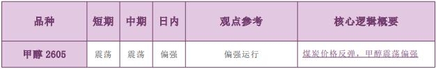 备注: 1.有夜盘的品种以夜盘收盘价为起始价格,无夜盘的品种以昨日收盘价为起始价格,当日日盘收盘价为终点价格,计算涨跌幅度。 2.跌幅大于 1%为弱势,跌幅 0~1%为偏弱,涨幅 0~1%为偏强,涨幅大于1%为强势。 3.偏强/偏弱只针对日内观点,短期和中期不做区分。 主要品种价格行情驱动逻辑—商品期货能源化工板块 甲醇(MA) 日内观点:偏强 中期观点:震荡 参考观点:偏强运行 核心逻辑:随着前期利多因素逐渐消化,受困于国内甲醇供应压力不断增大,同时面对国内煤炭期货价格大幅回调的拖累,甲醇期货反弹受阻,转而重新陷入回调走势。目前港口库存和内陆地区库存小幅回落,但依然处于高位。同时下游需求改善不足,烯烃盘面利润走弱。随着国内煤炭期货价格企稳反弹带动,本周三夜盘国内甲醇期货维持震荡偏强的走势,期价小幅收涨,预计本周四国内甲醇期货或维持震荡偏强的走势 责任编辑:七禾小编 |