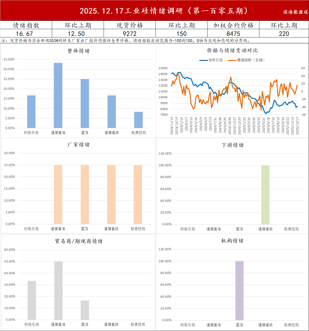 | 报告品种:工业硅 原文链接:https://mp.weixin.qq.com/s/ADANvAdu3BVjSfTMjq55bw 根据样本统计,本期情绪指数为16.67,较上期继续回升12.5,样本参与者对未来一周的情绪整体略偏强,分身份来看,主要是贸易商/期现商更偏乐观,而其他参与者仍相对偏悲观。连续下跌后,本周期现价格有修复反弹,部分厂家出现一定抵抗情绪,但整体供需宽松,局势仍偏弱。