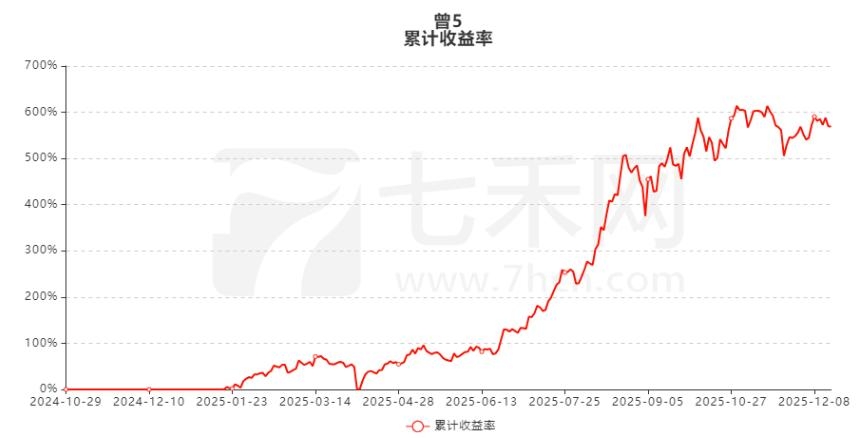 账户“曾5”,于2024年10月29日在七禾网资管排行榜上注册,2025年1月21日才开始交易。整体表现来看,该账户收益率逐步增长,净值不断创新高,不过进入9月以后,账户收益率增速放缓,资金曲线呈震荡横盘态势。截至目前,账户累计净值6.6912,累计收益率569.12%,累计净利润285.15万,最大回撤41.53% 。