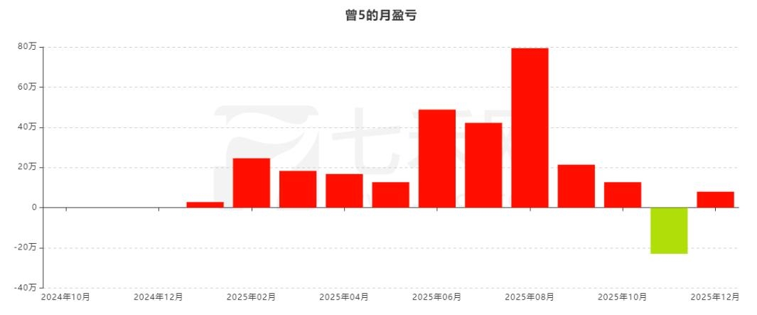 从每月盈亏表现来看,账户“曾5”共计交易12个月,仅亏损1个月。
