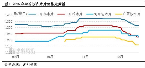 | 【导语】11月中下旬以来,木片市场资源存在恢复性增长过程,供给端对于市场的偏空驱动增强,进而拖累市场价格重心下移。12月上旬基本延续此种格局,近日北方局部有短暂雨雪天气,影响供货节奏,但浆企总体收购心态偏理性,预计元旦前木片市场或维持偏弱格局。 12月以来国产木片市场价格继续下探 12月以来,外部天气因素并无明显扰动,木片市场资源继续呈现稳中有增状态,供给格局趋于宽松。在收购压力得以阶段性缓解的情况下,浆企收购政策逐渐灵活调整,部分浆企相继下调收购价格,进而拖累市场重心逐步下移。除去供给端因素施压外,亦有部分浆纸一体化企业反馈,由于下游造纸价格提涨的落实情况不及预期,企业为改善盈利,主动调整木片收购价格以控制成本。截至12月18日,山东市场杨木净片、山东市场松木净片、河南市场杨木净片以及广西市场桉木净片均价分别为1315元/绝干吨、1225元/绝干吨、1220元/绝干吨和1160元/绝干吨,较11月末价格分别下行4.01%、6.49%、4.69%和4.53%。