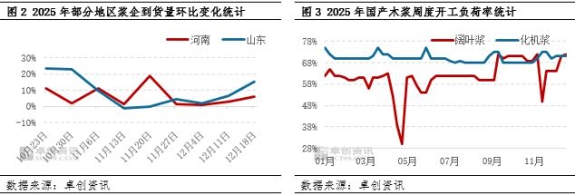 供给趋于宽松,需求变化有限,市场利好动能不足 从图2可以看出,山东及河南地区浆企木片到货量的周度环比变化自10月下旬开始总体位于正向区间,这直接表明了供给端逐渐趋于宽松的态势,主要受到自10月末以来天气多数时间维持晴好状态、农户农忙结束后上山伐树的积极性提升、木片加工及发运进程有所提速、浆厂收购价格偏于高位等因素共振影响,供给端逐步趋于宽松,对于市场价格的驱动方向走转为偏下。截至12月18日的数据来看,山东及河南地区浆企木片到货量分别较11月末增长25.11%和10.36%,供应端对市场的施压作用延续。 从图3可以看出,国产阔叶浆以及化机浆开工有小幅上行调整,主要受到个别浆企产线检修结束后恢复相对正常生产状态带动,总体开工呈相对稳健态势运行。截至12月18日当周,国产阔叶浆以及化机浆开工负荷率分别较11月末提升8个百分点及1个百分点。下游木浆开工水平趋于回升,对于木片的需求而言存有利好,但本次提升主要为前期检修产线复产,并非纯新增需求,因此利好程度不明显。