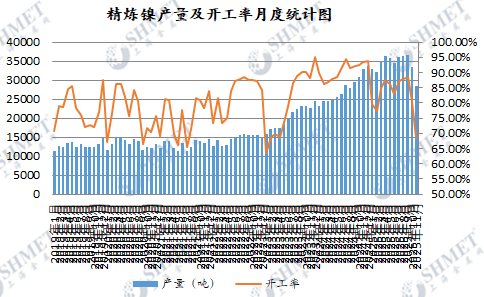 | 报告品种:镍 原文链接:https://www.shmet.com/news/newsDetail-2-907645.html 上海金属网12月18日讯:根据SHMET调研,2025年11月份国内精炼镍产量在28330吨,环比进一步下降,同比去年同期减少14.05%。11月份国内消费弱于之前,旺季过后步入淡季订单需求减弱,宏观面风险有所扩大,镍价总体震荡区间下移,用家逢低刚需采购,备货量受限,市况活跃度偏淡;老牌企业开工变化暂时不大,部分针对新能源电池行业的企业产量降低,并直接影响整体产出减少,当期精炼镍冶炼开工率修正后降至68.4%附近。