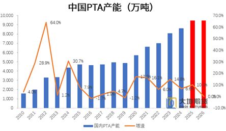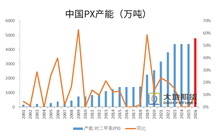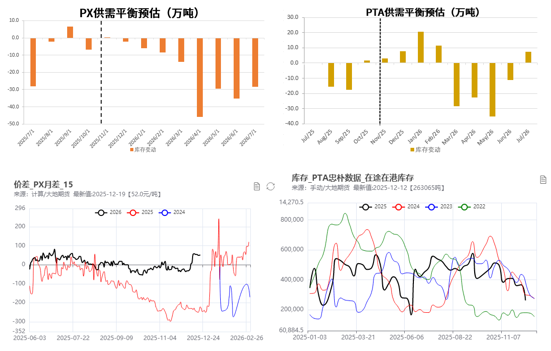 数据来源:钢联、CCF、大地期货研究院 2026年,国内PX待投产装置共有410万吨,投产增速9.3%。包括福佳大化扩建60万吨,华锦200万吨,九江石化150万吨。但从投产时间来看,福佳大化将于今年年底或2026年年初出料,华锦在2026年三季度落地,九江石化要到四季度才能投产,且存在推迟的可能性。因此全年来看,PX产能确定落地的只有260万吨,且供应压力主要体现在下半年。2026年,PTA无新投产装置,但需要消化2025年几套新投产装置的产能。因此上半年,PX、PTA进入投产真空期。相对其他化工品,PX和PTA投产增速低,在化工套利中属于多配品种。 03 供需格局现实以及预期均偏紧