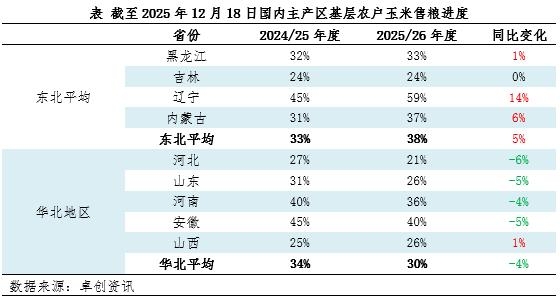 基层惜售,售粮进度提速缓慢 截至12月18日,华北产区平均售粮进度为30%,整体较去年同期偏慢4个百分点;东北产区平均售粮进度为38%,较去年同期偏快5个百分点。华北产区方面,河北、山东、河南、安徽售粮进度均慢于去年,原因在于基层略显惜售,进入12月份后销售提速缓慢,而去年同期集中售粮进度快速提升,当前华北地区基层农户售粮积极性不高,部分考虑10-11月份销售潮粮价格不佳,对余粮的心理价位存相对较高预期。东北产区方面,基层农户惜售氛围浓厚,要价坚挺,部分地区暂无资金压力。内蒙古、辽宁前期售粮进度较快,提升东北产区平均速度。