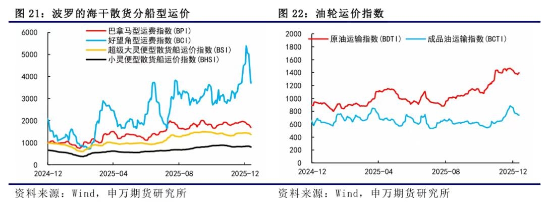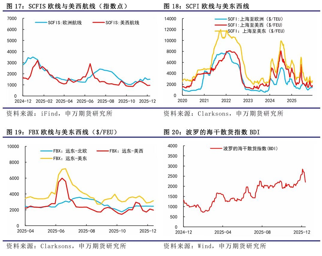 三、总结展望 后市来看,1月初MSK挺价略不及预期,PA联盟和OA联盟表价相对偏高一定程度上推动市场对于1月中旬船司进一步挺价的乐观预期。12月下旬PA联盟价格较为坚挺主因在于其部分航线的空班,最新船期统计来看,wk02起PA联盟已未有停航,同时考虑到春节前一个月左右揽货压力将逐渐增加,1月中旬挺价或存疑,预计运价拐点逐渐明确,若船司先表价提涨以推动揽货或会使得市场进一步冲高,但02合约不宜过分乐观。 四、其他航运数据跟踪