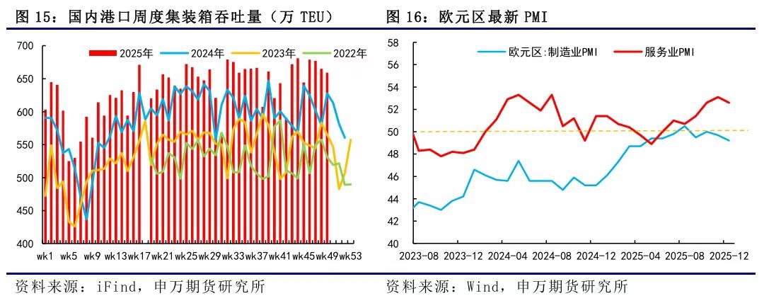 3、需求方面 欧线需求延续往年季节性表现。通常来说,10月起揽货压力通常会有所下降,船司也会逐渐为年底旺季挺价蓄力,但10月大多还是对应着季节性的需求淡季,11月开始是欧洲年底消费季的最后发运期,补发货的需求逐渐启动带动货量转好,随后欧洲黑五及网络星期一消费后的补库存需求推动12月货量表现向好,其次是春节前的抢运需求。由于今年春节较晚在2月中旬,岁末年初货量持续性相对较好,存在1月中旬推动船司进一步挺价的可能,因此市场对于02合约相对并不悲观,当前已升水12合约150点左右。第50周国内港口集装箱吞吐量为658.9万TEU,环比下跌0.89%。 宏观方面,欧元区12月制造业PMI初值为49.2,为8个月以来新低,服务业PMI、综合PMI均创3个月新低。德国12月制造业PMI初值为47.7,创10个月最差表现。法国制造业出现积极信号,PMI大幅上升至50.6,创40个月新高。欧洲央行连续第四次维持基准利率在2%不变,符合市场预期。该行继续未就未来的政策路径提供指引,强调将根据数据逐次会议决策,并重申通胀将在中期内稳定在2%的目标水平。
