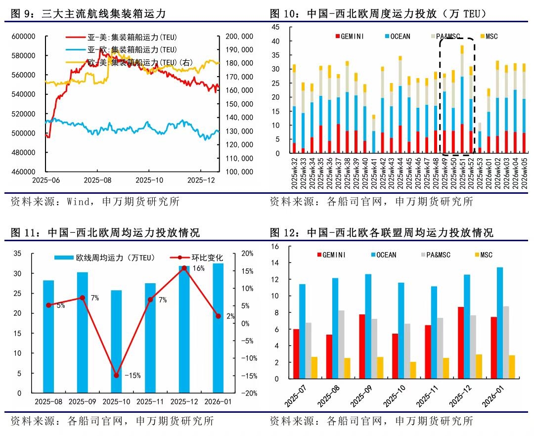 2、运力供给与周转 根据上海&宁波&青岛(AE5/NE4)-欧基港的船期统计情况来看,12月周均运力投放为31.82万TEU,1月周均计划运力为32.46万TEU,环比上涨2%。12月停航主要集中在OA联盟和PA联盟,合计共有5个空班,其中PA联盟空班均集中在FE3航线中,推动了FE3航线在12月下半月装载爆舱。到了1月,OA联盟空班下降至2个,主要集中在wk03和wk04,PA联盟的FE3航线在wk01继续空班以支持月初挺价,但FE4和FE6航线在wk01和wk02均有1个加班船,或一定程度上增加PA联盟揽货压力,关注其在1月上半月的实质落地运价。从周度节奏上来看,1月各周运力投放均在31万TEU之上,第一周运力投放最高接近34万TEU,第二周运力略有下降至接近33万TEU,总体1月上半月运力投放相对充裕。 地缘方面,10月巴以停火谈判出现显著进展,当地时间10月9日,第一阶段加沙停火协议正式生效,目前双方已完成第一阶段被扣押人员的互换,第二阶段停火协议谈判逐渐启动。据央视新闻,当地时间19日美国中东问题特使威特科夫在美国迈阿密与卡塔尔、埃及和土耳其高级官员举行会晤,重点讨论加沙停火第二阶段。美国国务卿鲁比奥19日在一场年终记者会上说,加沙问题“极其复杂”,但他“总体上保持谨慎乐观”。他表示,必须先完成加沙停火第一阶段协议,才能进入第二阶段。就第二阶段,需要先宣布成立战后监督加沙治理的“和平理事会”,并成立由巴勒斯坦技术官僚组成的委员会负责日常治理,再组建临时国际稳定部队,其中包括厘清这支多国部队的薪资如何支付、交战规则是什么、在加沙地带非军事化阶段发挥何种作用。