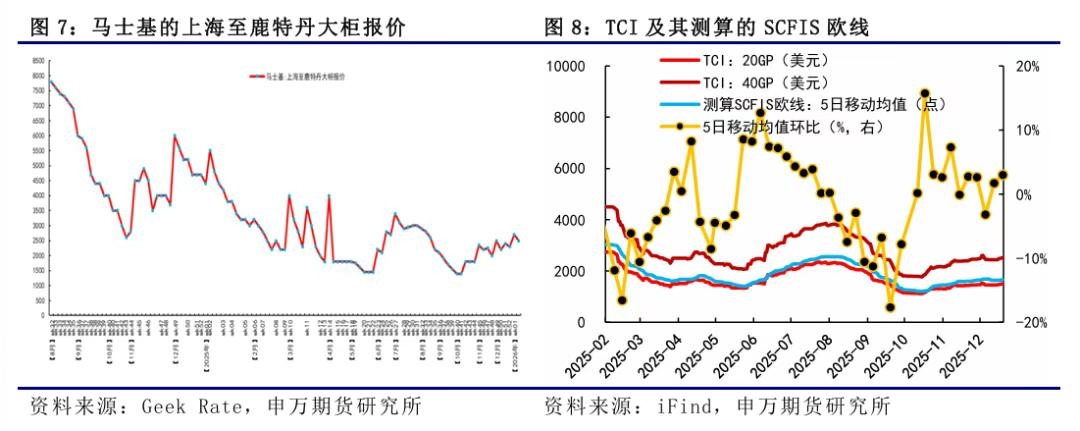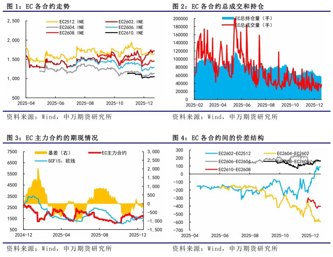 | 一、集运指数(欧线)期货 上周EC高位震荡,主力02合约在1700点附近震荡,市场对于1月船司挺价仍有乐观预期但预期空间有所降温。MSC率先线上1月开舱,1月上半月大柜报价2840美元,环比上涨200美元,与12月下半月涨幅一致,马士基周二至伦敦港试舱大柜2700美元,周三至鹿特丹开舱大柜报价2500美元,低于至伦敦港试舱价200美元,或一定程度上传递揽货压力带动市场回调。由于目前现货主要集中在12月底的揽货情况,部分船司如OOCL的12月底报价有所调涨,ONE在1月初开舱表价大柜3035美元,一定程度上均推动了市场的乐观情绪。 12月22日最新公布的SCFIS欧线为1589.20点,对应于12.15-12.21期间的离港结算价,较上期上涨5.2%,反映12月第三周欧线运价的提涨,作为第二期计入2512合约交割结算价,近两期均值为1549.88点。