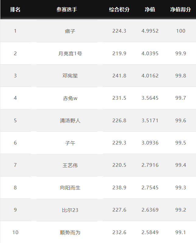 大赛净值排名前10名 2025.12.22