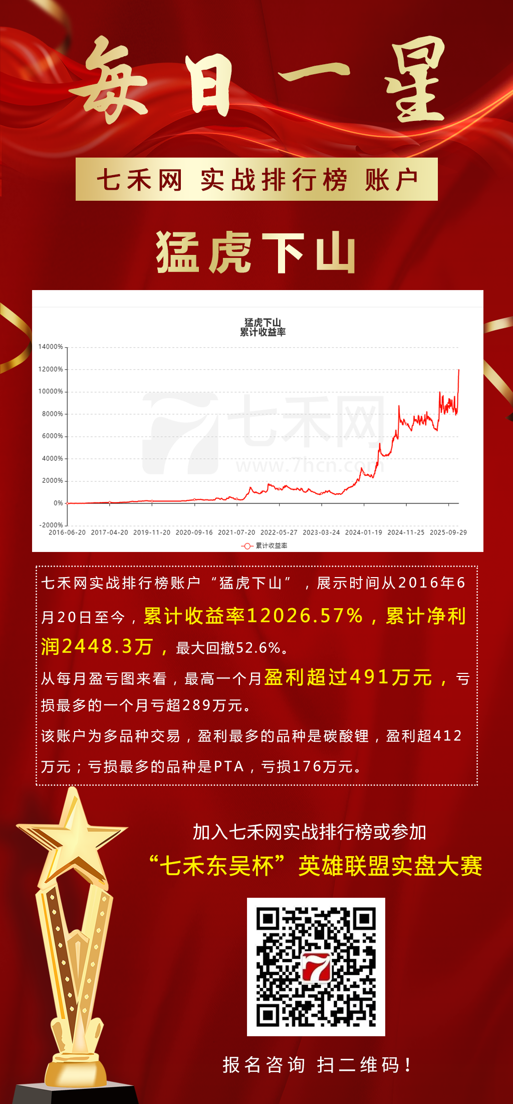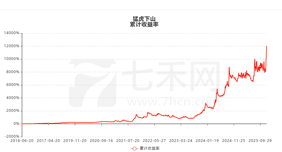 七禾网实战排行榜账户“猛虎下山”,展示时间从2016年6月20日至今,累计收益率12026.57%,累计净利润2448.3万,最大回撤52.6%。