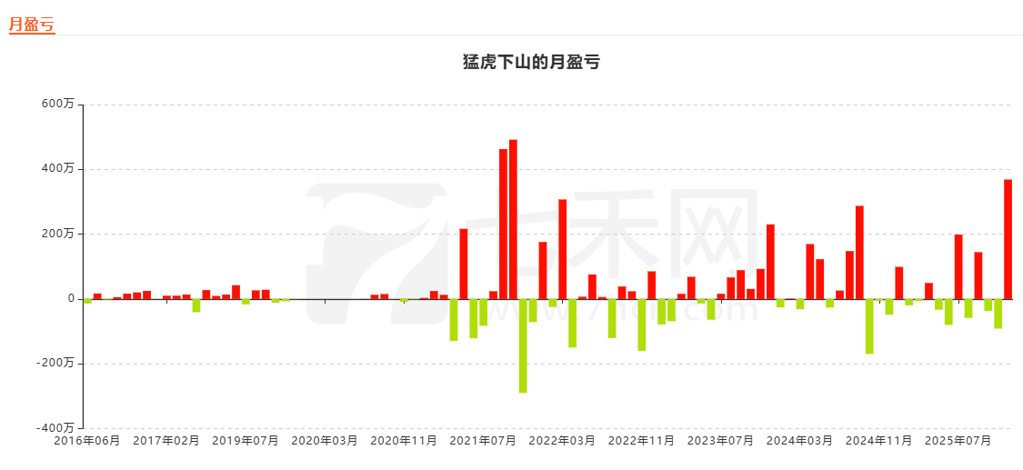 从每月盈亏图来看,最高一个月盈利超过491万元,亏损最多的一个月亏超289万元。