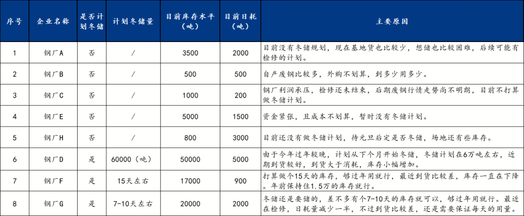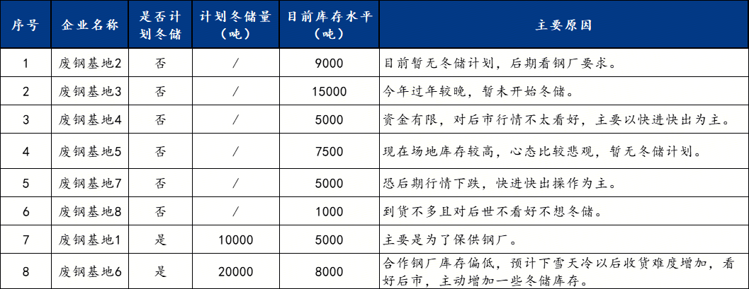 表2:废钢基地企业冬储调研情况汇总(部分代表性企业)