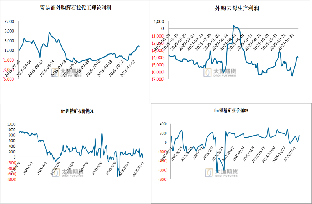 数据来源:SMM、Ifind、Wind,大地期货研究院 利润:近期外采利润小幅收窄 ,围绕1500窄幅波动 本周锂精矿FM报价sc6 CIF China成交价约1200+美金均价,价格跟随锂价波动,外采矿石代工利润,买矿抛05截止周四预计有1500左右的利润。代工量11月小幅走弱,对外报价仍在19500左右,如代工费开始下调,未来仍然会有部分矿端的隐性库存逐渐变为显性库存。目前一体化云母现金成本约为6万左右,部分技术较强的冶炼厂现金成本约5.5左右。锂精矿无论是港口库存还是矿山库存近期均维持去库的节奏,后续需跟踪矿端是否继续挺价。