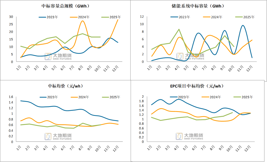 数据来源:大地期货研究院 终端需求:储能:今年以来中标价震荡下行,今年以来招标量提升明显