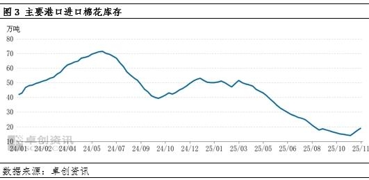 主港进口棉花库存回升 11月份以来,外棉到港数量增加,同时国内新季棉花集中上市,市场流通现货供给增加,但下游需求规模有限,同时,年底纺企所持棉花进口配额有限,港口实际出库量低于入库,净库存稳步回升。据卓创资讯统计,截至12月23日,国内主要进口港外棉库存34.7万吨,较11月初增加18.9万吨。