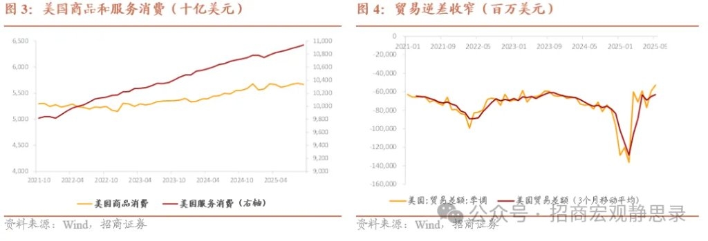 | 事件 2025年12月23日美国商务部经济分析局(BEA)发布:2025年三季度美国实际GDP环比折年率初值4.3%(前值3.8%)。 核心观点 美国25Q3实际GDP环比折年率初值超预期录得4.3%,其中过半为个人消费支出项所贡献,同时政府投资回暖,净出口项在一季度“抢进口”影响消退后持续均衡,投资项有小幅拖累。数据发布后,美元指数小幅反弹至98.1附近水平,对美联储政策敏感的美债2年期收益率大幅上行4.4个BP至3.54%附近,美债10年期收益率上行2.6个BP至4.19%附近。 具体来看: 1)25Q3美国个人消费支出环比折年增速录得3.5%(前值2.5%),拉动GDP增速2.4个百分点(前值拉动1.7个百分点)。其中,商品消费增速升至3.1%(前值2.2%),服务消费增速3.7%(前值2.6%)。 2)固定资产投资方面,AI主线和地产投资景气明显分化。非住宅投资录得2.8%(前值7.3%),拉动GDP增速0.4个百分点(前值1.0个百分点),其中设备和知识产权投资为主要贡献。25Q3非住宅投资建筑项的降幅扩大至-6.3%(前值-7.5%),设备项5.4%(前值8.5%),知识产权产品5.4%(前值15.0%)。住宅投资降幅走平在-5.1%(前值-5.1%),拖累GDP增速0.2个百分点(前值-0.2个百分点)。随着美联储降息,美国30年抵押贷款固定利率在25Q3小幅回落至6.3%附近,成屋销售折年数稳定在400万套附近水平。但随着移民政策变化、需求侧降温,作为先行指标的美国已获批准新建私人住宅折年数在25Q3持续放缓,截至8月份已降至133万套(前值136.2万套),已开工的新建私人住宅折年数放缓至130.7万套(142.9万套)。 3)由于一季度美国企业“抢进口”积累了大量库存,存货投资在25Q3拖累GDP增速0.2个百分点(前值-3.4个百分点),企业库存持续去化。 4)政府支出方面,政府支出本季拉动GDP增速0.4个百分点(前值为0.0个百分点),其中联邦政府支出贡献0.2个百分点(前值-0.4个百分点),国防项拉动0.2个百分点(前值0.0个百分点),非国防项拉动0.0个百分点(前值-0.4个百分点),特朗普政府减支和DOGE减员的影响逐步消退。州和地方政府支出贡献0.2个百分点(前值0.3个百分点)。 5)净出口方面,本季拉动GDP增速1.6个百分点(前值4.8个百分点),一季度“抢进口”效应过后商品贸易逆差持续收窄。根据BEA最新公布的25年9月贸易数据,当月贸易逆差录得528.28亿美元(前值592.65亿美元),其中商品贸易逆差录得789.85亿美元(前值860.59亿美元),服务贸易顺差录得261.57亿美元(前值267.95亿美元)。 数据发布后,对美联储政策敏感的美债2年期收益率大幅上行4.4个BP至3.54%附近,美债10年期收益率上行2.6个BP至4.19%附近,CME数据反映海外市场仍预计26年降息两次为较大概率场景。美元指数反弹至98.1附近水平,日元受日本财务大臣口头干预支撑后在156附近波动。美股三大指数短线承压后反弹,标普在6881点附近波动,纳指小幅调整至23430点附近。