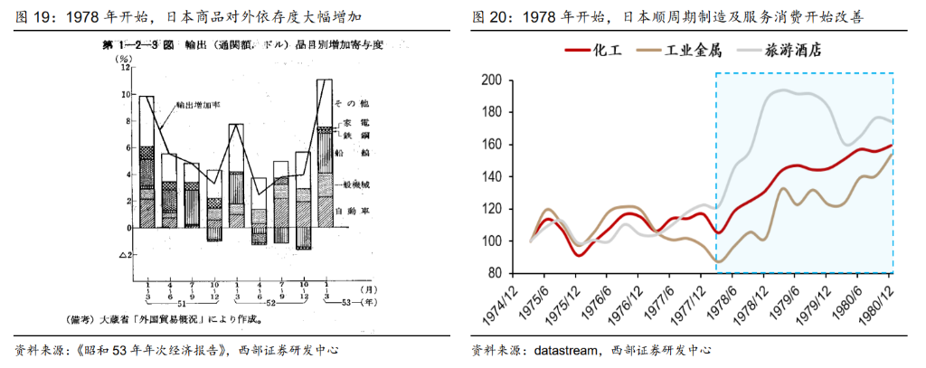 配置建议:迎接顺周期的“冰火转换” 伴随着“扩内需”政策的陆续落地,以及国内优势产业的出口加速,制造和消费顺周期将 有望迎来一轮复苏周期。日本优势产业的出口,叠加日本国内顺周期政策的推动,带动了 日本在 1978 年的一轮经济修复,并推动了制造业和服务业消费的修复。从 1978 年开始,化工、工业金属、旅游等产业迎来显著的复苏。