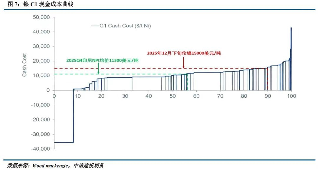 假设从镍矿开采到MHP一体化转产电积镍,其中对钴的征税成本完全由电积镍承担,那么届时将影响电积镍成本约60.96-220.38美元/吨。总体来看,虽然钴自身的价格较高,但由于钴含量较低且目前预期的税率不高,所以我们初步估计对镍价的成本抬升相对有限,但后市仍需关注实际政策落地情况。 四、镍价修复至中国镍铁C1现金成本,短期向上动能有限 从价格走势看,本轮镍价已反弹至15000美元/吨附近,位于成本曲线的90分位处,接近中国镍铁C1现金成本。但目前定性看,国内不锈钢市场表现仍旧疲软,需求支撑乏力或难给到铁厂足够利润,因此我们判断短期内,若无基本面需求的有效支撑,那么镍价持续上行的动能或相对有限。展望2026年,我们依然看好MHP的大规模放量,相应地电积镍产能释放或将继续带来供需压力。虽然25Q4期间印尼镍铁价格高于C1成本,但在考虑资本开支的情况下,目前印尼镍铁项目亦基本亏损,短期印尼镍铁价格触底,不锈钢成本支撑在2026年有望迎来修复。