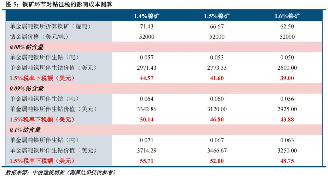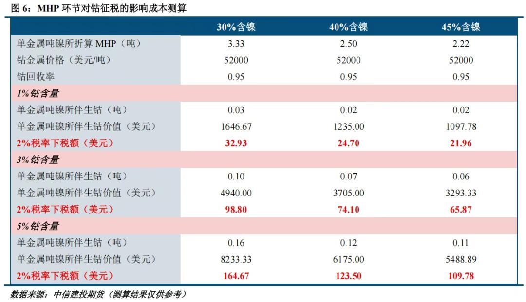 在红土镍矿HPAL工艺生产富含镍、钴的氢氧化物MHP中,通过对产成品进行浸出、净化和分离,可以实现对钴的回收,而由于钴具备较高的附加值,冶炼企业又可以实现收益抵扣。因此,对MHP生产所回收的钴进行征税,同样有可能增加企业成本负担。彭博援引APNI消息称,初步建议对中间品中的伴生钴征收2%的税率,我们对不同镍钴含量MHP的征税成本测算,结果显示单金属吨镍成本将因征税而增加成本在21.96-164.67美元不等。