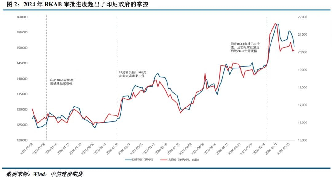 二、印尼资源民族主义:下游化与行政能力、国家收入的矛盾 近期印尼连续释放两条政策调整,第一性的问题是本轮行情波动下,二者谁的影响权重更大?不同于市场一般观点,我们认为,看似将大幅缩减原料供应的RKAB配额削减政策,其影响权重反而要更小。主要原因是印尼政府在面对RKAB审批问题时,往往表现得更加“失控”。 首先以2024年上半年镍价走势为例,当年年初市场消息称印尼RKAB审批速度十分缓慢,仅4家企业获得配额,一度引发市场担忧情绪。不过印尼官员随后出面表示审批工作仍在积极推进中,并表示预计将在当年3月底之前完成全部审批工作,之后随着配额不断发放,市场情绪也得到了极大缓解。但在当年5月下旬,市场消息称印尼RKAB审批工作仍未完成,且实际审批速度相较24Q1十分缓慢,情绪担忧下镍价又再度强势反弹。总而言之,印尼对RKAB审批进展的掌控失灵,背后所反映出的是其下游化愿景与行政能力的不匹配,这也更容易导致市场弱化对政策消息的敏感性。