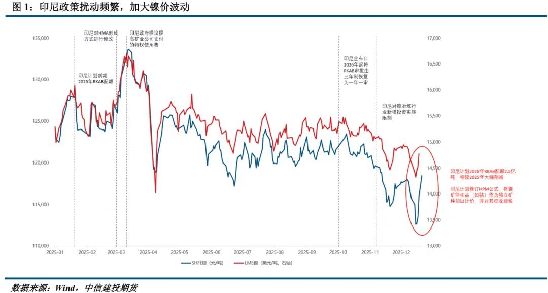 | 一、印尼政策调整引发市场行情波动 近期镍及不锈钢价格出现较大幅度反弹,我们认为核心驱动因素在于印尼政策扰动,具体来看包括两条信息: ①印尼2026年RKAB配额计划2.5亿吨,较2025年RKAB设定的3.79亿吨大幅下降,但最终实施方式尚不明确; ②印尼能矿部计划于2026年初修订镍商品的矿产基准价格(HPM)计算公式,将把镍伴生品(如钴)作为独立矿种加以计价,并对其征收税额,新的HPM计算公式预计将在2026年1月或2月发布。
