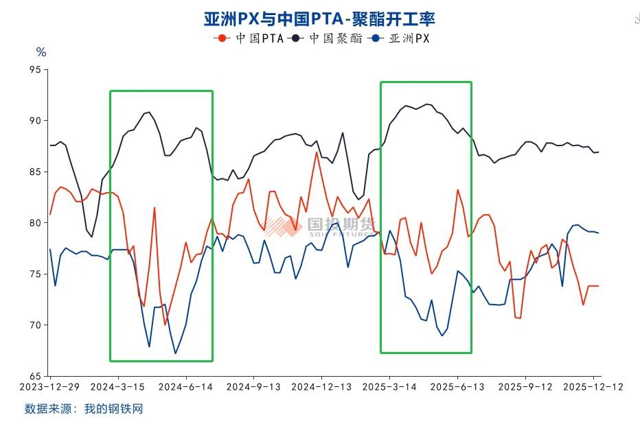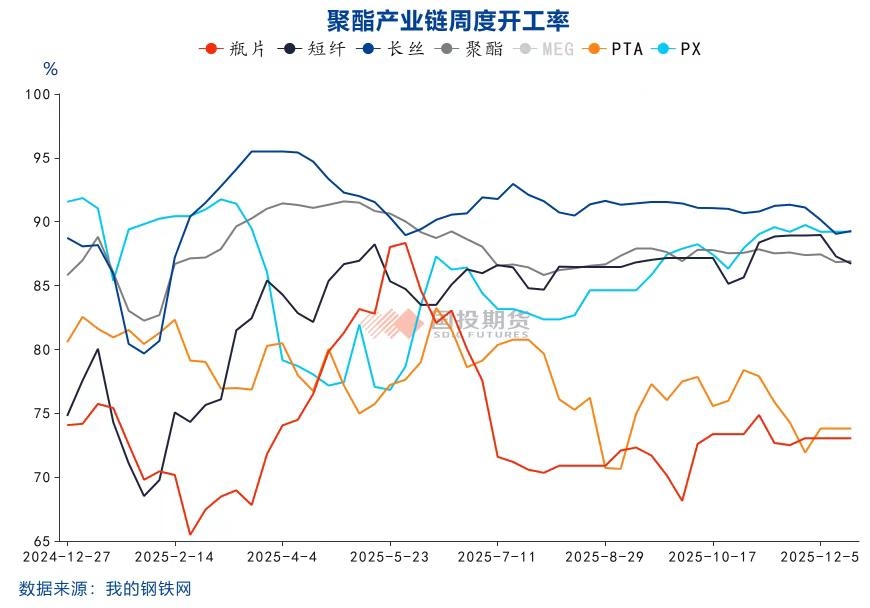 02 需求存在负反馈风险 PX终端需求集中在聚酯行业,包括涤丝和瓶片两大领域。其中瓶片下游饮料行业处于淡季,瓶片负荷处于75%以下偏低位;涤丝下游集中在纺织服装领域,双十一之后国内纺织开工率也在逐渐下滑。 聚酯工厂在经过了上周的产销放量之后,企业的涤丝库存压力已经完全释放,且2026年春节较晚,在低库存情况下,聚酯企业一般会维持正常生产,直至1月中下旬视市场的情况决定检修时间和规模。但目前聚酯环节面临的是大幅下降的现金流难题,已经有聚酯厂“喊话”降负。从时间上看,春节前为PX下游需求下行期,难以对上游PX形成持续有力提振;上游快速涨价,下游陷入现金流大幅下滑的困境,会对聚酯原料产生阶段性负反馈拖累,但难以形成深度冲击。