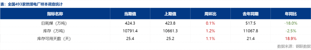 | 报告品种:焦煤 原文链接:https://mp.weixin.qq.com/s/-Ql1wslc6shid-mvCBxwVA 近日,主产地区域内多数煤矿基本保持正常产销,完成年度生产计划停产检修煤矿逐渐增多,市场供应略有收紧。昨夜主力煤企站台外购价格持稳,矿区观望情绪依旧浓厚,下游用户采购拉运需求有限,在产煤矿出货情况仍较一般,整体调价意愿不强。 需求方面,近日,受全国性偏暖气候影响,居民采暖用电增长有限,电厂整体日耗提升乏力,在长协煤供应充足、库存高位背景下,终端电厂对市场煤采购稀少,仅维持少量刚需采购。非电方面,目前煤炭市场降幅有所缩窄,部分区域小涨,水泥、化工等非电终端用户采购则按需进行为主,对市场观望情绪浓厚,需求端整体难以对现货市场形成有力支撑,以维持现有库存为主。本文将对上周终端电厂样本数据进行解读,同时对于近期市场以及后续影响需求的因素进行简要分析。 据Mysteel统计,截止12月19日全国493家电厂样本日耗煤424.3万吨,环比增0.5万吨,厂内存煤总计10791.4万吨,环比增130.0万吨,可用天数25.4天,环比增0.3天。