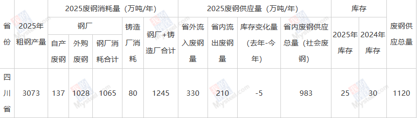 数据来源:Mysteel废钢事业部 目前四川省重点钢厂废钢需求量在1165万吨,其余铸造企业需求约80万吨,四川省废钢总需求量约1245万吨。钢厂废钢需求均根据钢厂调研所得,其余则根据生产设备容积及产能测算。 四川省作为典型的废钢资源输入型市场,聚集了众多电炉企业,废钢需求规模庞大。由于本地资源难以满足实际消耗,每年约有四分之一的废钢需从省外调入,主要来源地为重庆、西藏、贵州、云南等周边地区。输入料型以重废、中废和剪料为主,均为电炉生产所必需的关键原料。受复杂地形条件限制,公路运输凭借其灵活性强、适应性高的特点,成为废钢输入的主要方式。总体来看,2025年四川废钢市场仍延续供不应求的紧张格局。 值得关注的是,尽管本地废钢资源整体紧缺,今年仍有约210万吨废钢资源流出至周边省份。这一现象的背后,反映出四川电炉企业在优质废钢采购竞争中,相较于长流程企业处于相对弱势地位。部分贸易商为追求更高利润,倾向于将废钢销往山西、陕西等长流程钢厂集中、收购价格更具优势的省外市场。此外,电炉企业对废钢尺寸、料型等有严格要求,压块等形态的废钢接受度较低,此类不符合标准的资源多被运往陕西、贵州、重庆等地的高炉钢厂,进一步加剧了四川省内废钢的供应压力。 2025年川内个别短流程钢厂长期处于停产状态,但个别钢企第二季度开始复产,使得消耗量大于2024年。今年市场反应产废企业、拆房、下游工地废钢产出量明显下降,但从数据来看,产量小幅增加。主要是由于钢厂布局合作基地,竞争力大于普通市场基地。但考虑到房地产、基建项目预期减弱的大趋势,2026年四川废钢市场供应将延续紧张格局,供需矛盾难以缓解,省外流入或继续增加。 四、展望 宏观方面:2026年预计将继续坚持稳中求进工作总基调,进一步加强宏观政策逆周期和跨周期调节的协同配合,财政政策仍有发力空间,货币政策不会“大放大收”,降准降息更加注重“相机抉择”。宏观政策的连续性、稳定性,有利于稳定市场预期,不过目前废钢市场由“基本面”主导。 需求方面:鉴于近几年短流程钢厂长期错峰生产的低耗状态,预计2025年川内钢厂需求增量有限。值得一提的是,个别长期停产钢厂有望复产,或能增加一定需求量。自川内短流程钢厂开始技改后的几年里,废钢需求整体保持稳健增长态势,价格支撑性较强。 供应方面:在房地产行业持续调整的背景下,预计2026年四川省内废钢资源生成量仍将相对有限,供应偏紧的格局难以根本改变。随着省内需求稳步释放,对外部资源的依赖度可能进一步上升。 综上所述,结合宏观政策环境、需求端的稳步释放以及供应面的结构性约束,预计2026年四川废钢市场价格或呈现先扬后抑、区间震荡的特征,整体均价较2025年继续小幅下移约5%。 七禾带你去调研,最新调研活动请扫码咨询