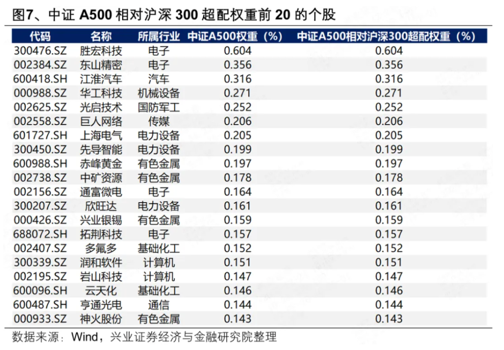 个股方面,中证A500相比沪深300超配比例居前的公司为:胜宏科技、东山精密、江淮汽车、华工科技、光启技术、巨人网络、上海电气、先导智能、赤峰黄金、中矿资源。